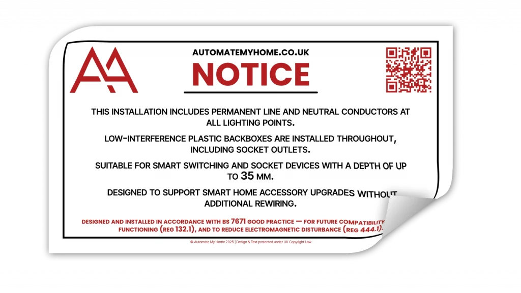 Our installations are labelled with a Smart-Ready compliance notice — your visible assurance that the wiring design meets the intent of BS 7671 Reg 132.1(ii).
